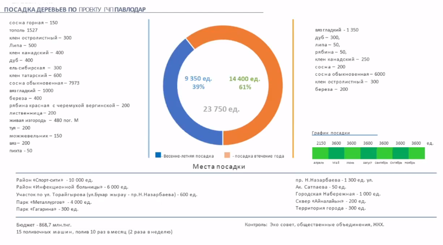 В этом году на озеленение Павлодара потратят почти миллиард тенге: 870 миллионов по проекту государственно-частного партнерства на посадку деревьев и 120 миллионов на посадку цветов. По информации горакимата, 64% запланированных к высадке растений - это хвойные. Информацию об объемах компенсационной высадки растений и местах размещения аким области поручил вовремя доводить до населения.