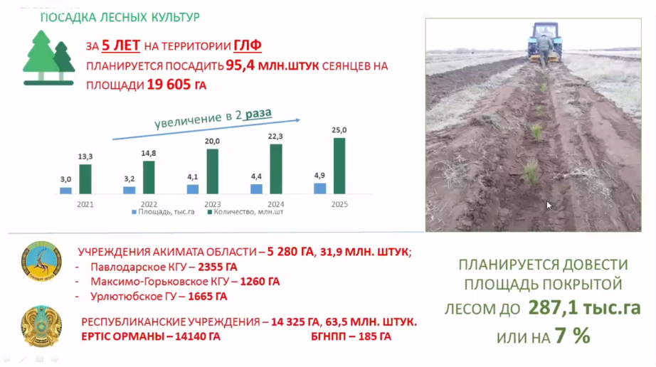 Управление недропользования работает над открытием лесопитомника на месте старого, не работающего с 90-х годов. Он находится в районе села Павлодарское, площадь составляет около 21 гектара. Предварительная стоимость – более 200 миллионов тенге. Ежегодно он сможет выпускать около 12 миллионов саженцев.