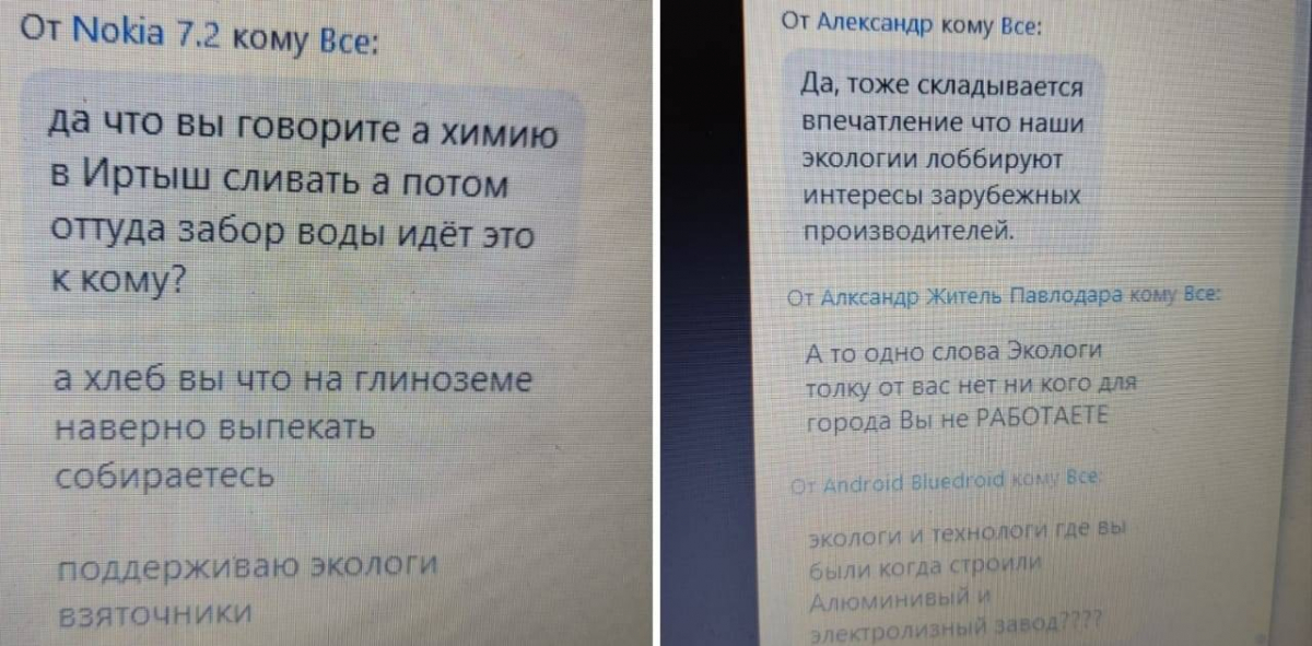 Несмотря на то, что на слушаниях не принимают решения о реализации проекта голосованием, определенная группа людей продолжала атаковать чат фразами, что они «за». А во время того, как участникам слушаний дали возможность задавать вопросы, в адрес тех, кто интересовался воздействием завода на окружающую среду, сыпались оскорбления и обвинения в том, что это проплаченные зарубежные конкуренты не дают возможность развиваться павлодарскому предприятию.
